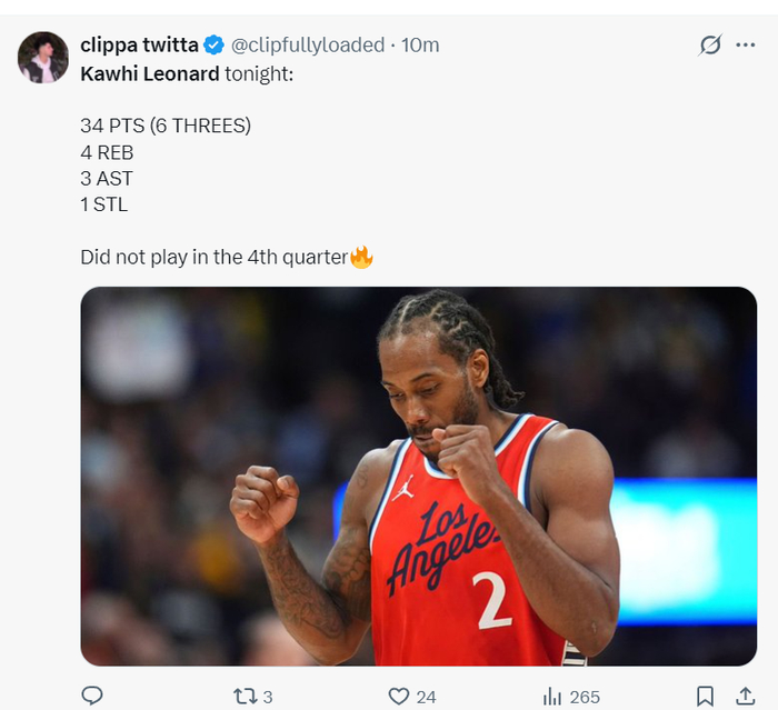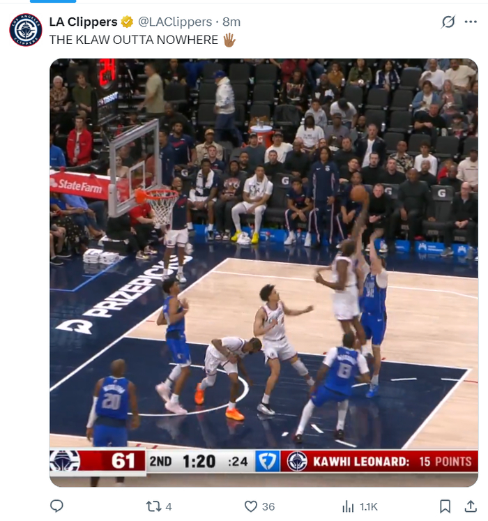 北京时间4月8日,NBA常规赛,快船以116-103击败独行侠拿到二连胜。这场比赛小卡三节打卡拿到34分,他连续55场比赛拿到20+,而且快船最近的52场比赛拿到35胜17负,这已经完成了此前泰伦卢说的55场赢35场的指标。这场比赛快船主场的每一个座位上都贴着科怀-伦纳德生涯的履历,开场小卡的表现也的确炸裂,他带队打出了一波17-0的攻防浪潮,他此前已经连续...